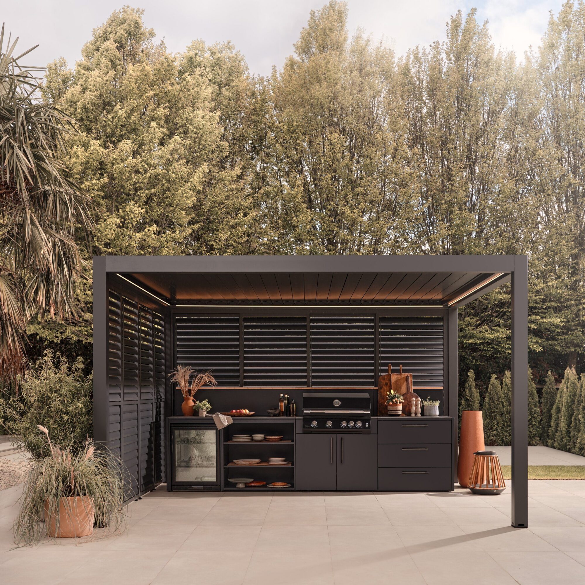 Erweitere deine Küche nach Bedarf um Outdoor-Kühlschränke, Spülen oder zusätzliche Seitenbrenner, um die Wege ins Haus zu minimieren. Diese Geräte machen deine Außenküche zur vollwertigen Kochstation, in der du von der Kühlung bis zum Abwasch alles direkt vor Ort erledigst.
